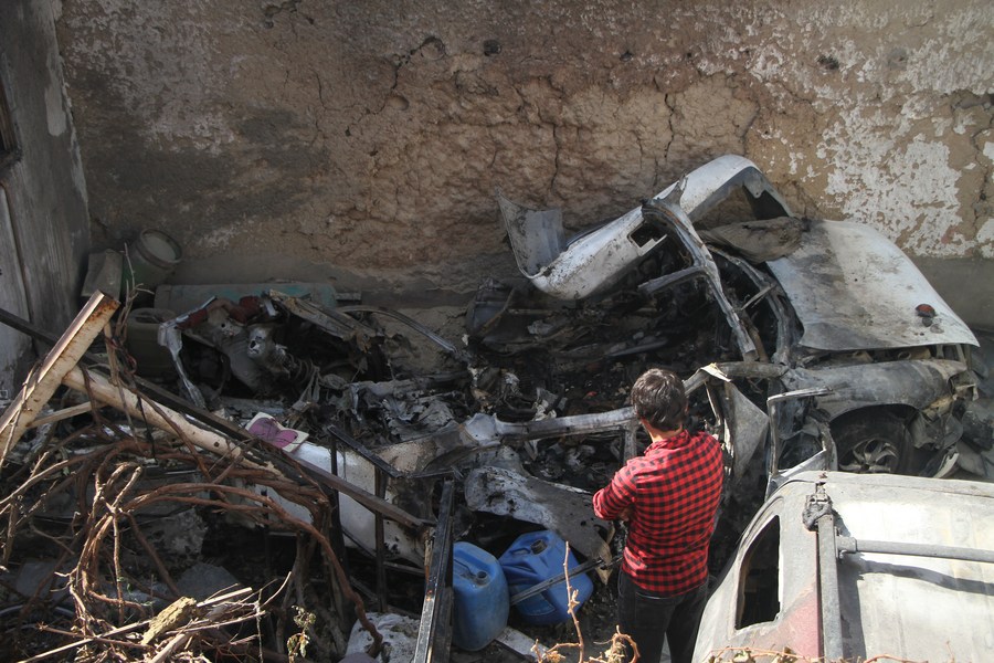 Photo taken on Sept. 2, 2021 shows damaged vehicles at the site of the U.S. airstrike in Kabul, Afghanistan. (Photo by Saifurahman Safi/Xinhua)