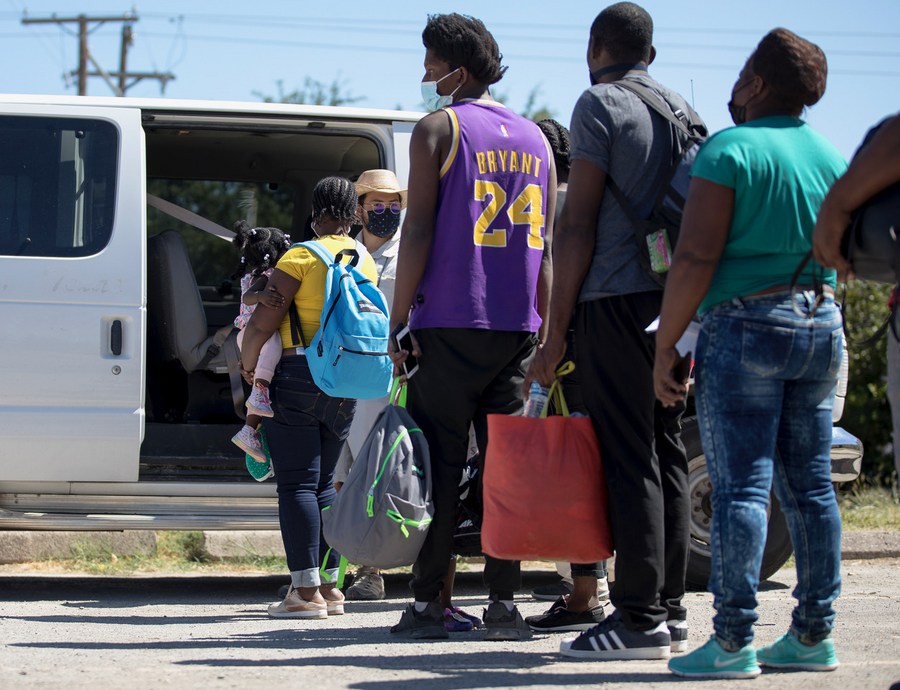 Haitian migrants who are seeking asylum wait to get into a van to be transported from Del Rio, Texas, the United States, Sept. 24, 2021. (Photo by Nick Wagner/Xinhua)