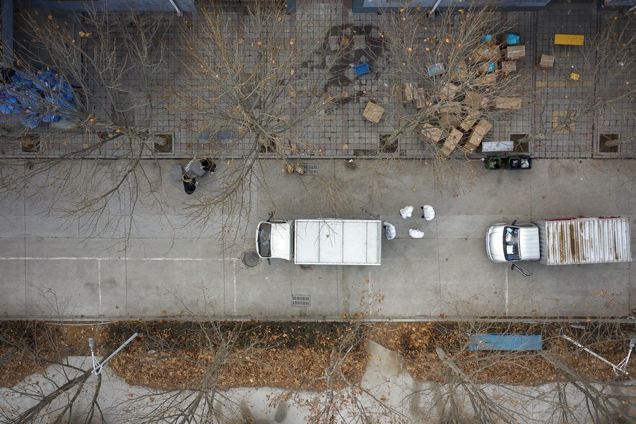 Workers distribute daily necessities at a goods transferring point in Anyang of central China's Henan Province, Jan. 14, 2022. (Photo by Ma Xiaoran/Xinhua)