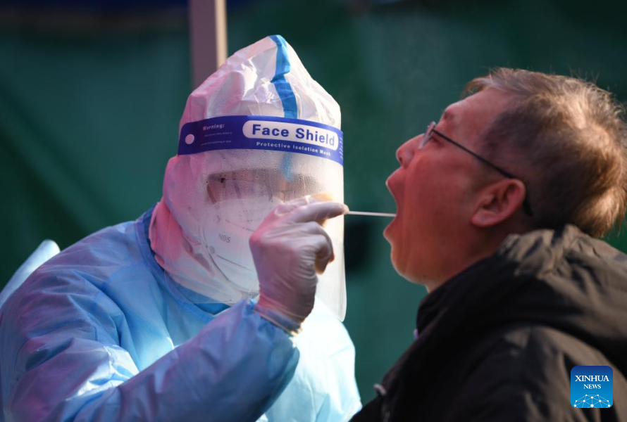 A medical worker takes a swab sample from a citizen for nucleic acid test at a COVID-19 testing site in north China's Tianjin, Jan. 15, 2022. North China's Tianjin Municipality launched the third round of citywide nucleic acid testing at 7 a.m. Saturday. (Xinhua/Sun Fanyue)