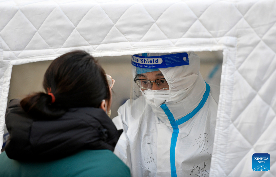 A medical worker takes a swab sample from a citizen for nucleic acid test at a COVID-19 testing site in north China's Tianjin, Jan. 15, 2022. North China's Tianjin Municipality launched the third round of citywide nucleic acid testing at 7 a.m. Saturday. (Xinhua/Zhao Zishuo)