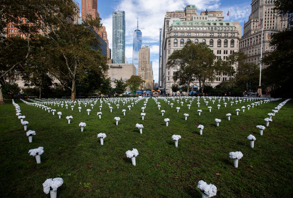 Photo taken on Oct. 8, 2021 shows the vases of flowers installed to memorize gun violence victims at the Battery Park in New York, the United States. (Xinhua/Wang Ying)