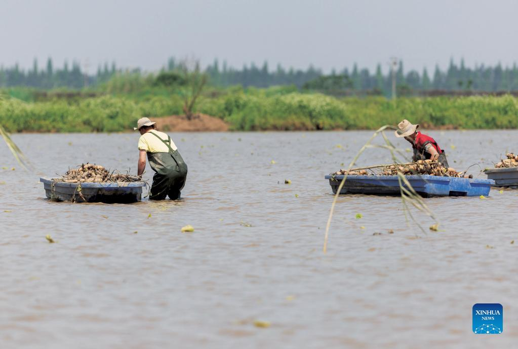 Workers plant lotus roots at Nanchang Five Stars Siberian Cranes Sanctuary by the Poyang Lake in Nanchang, east China's Jiangxi Province, April 30, 2021. Poyang Lake, the country's largest freshwater lake, is an important wintering spot for migratory birds. To ramp up forage supplies for the birds, in 2021, the local government of Yugan County issued a compensation policy for farmers, and reserved rice for migratory birds. In Nanchang Five Stars Siberian Cranes Sanctuary by the Poyang Lake, cranes have been attracted there for food on a lotus pond. The pond, initiated and invested in by bird lovers in 2017, is expected to provide enough food for the cranes in winter. With the support of local authorities, the pond is also developed into a base for scientific research and education, as well as for international exchanges. (Xinhua/Wan Xiang)