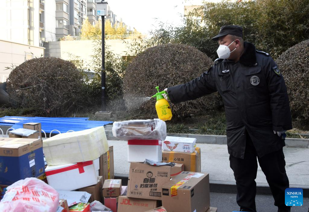 A staff member disinfects parcels to be delivered to residents at a residential area in Haidian District of Beijing, capital of China, Jan. 16, 2022. Beijing reported one new locally-transmitted COVID-19 case Saturday, local health authority said. The community where the comfirmed case lives is under close-off management. (Xinhua/Ren Chao)
