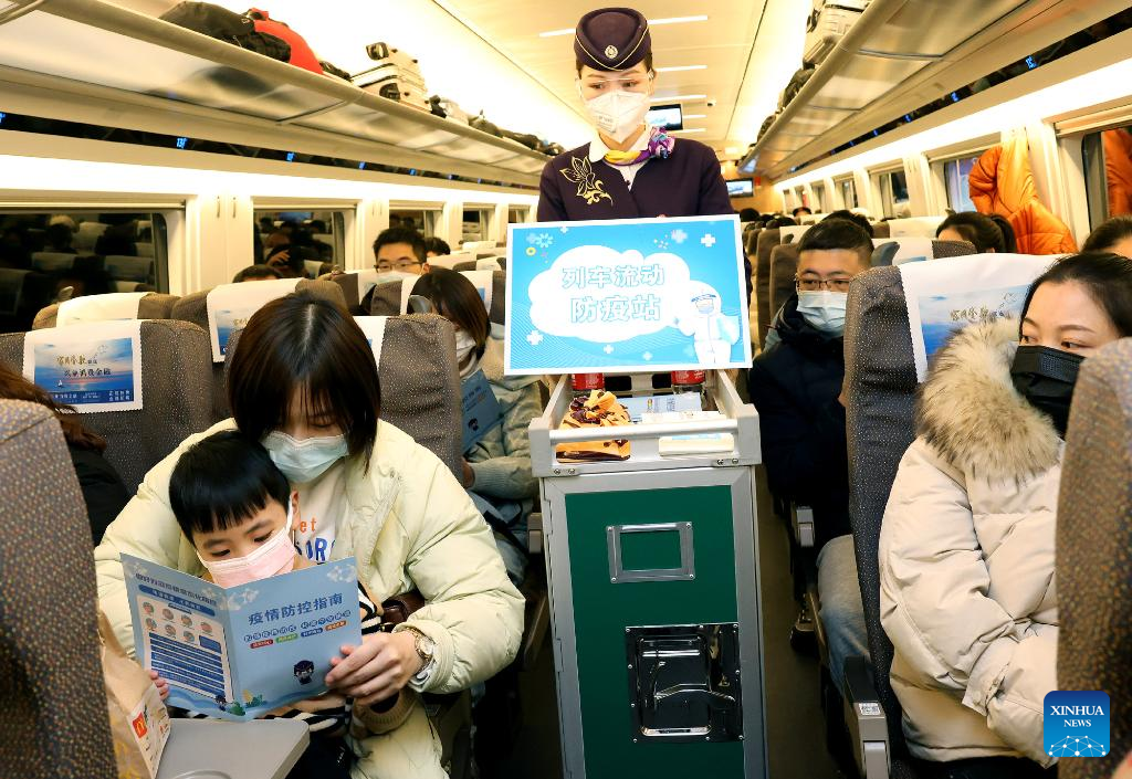 A crew member distributes epidemic prevention pamphlets on train G1724 in east China's Shanghai, Jan. 16, 2022. The Spring Festival travel rush, China's largest annual travel rush, will last from Jan. 17 to Feb. 25 this year. During the 40-day travel season, also known as chunyun, many Chinese people will travel to meet their families for the Chinese Lunar New Year, or Spring Festival, which will fall on Feb. 1, 2022. (Xinhua/Chen Fei)