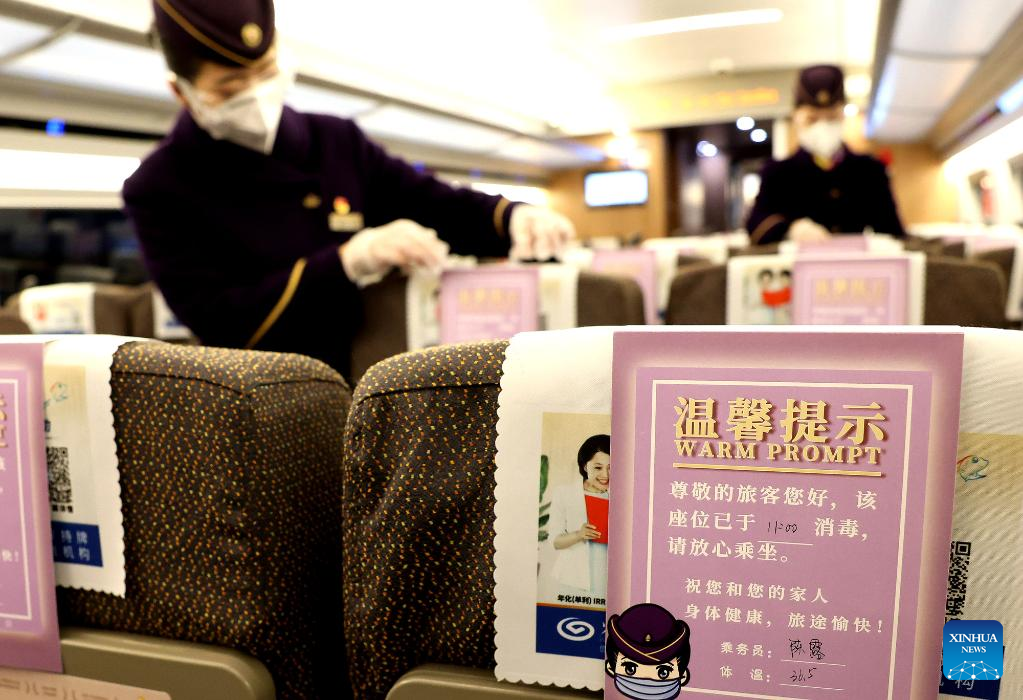 Crew members place disinfection notices on train G1724 in east China's Shanghai, Jan. 16, 2022. The Spring Festival travel rush, China's largest annual travel rush, will last from Jan. 17 to Feb. 25 this year. During the 40-day travel season, also known as chunyun, many Chinese people will travel to meet their families for the Chinese Lunar New Year, or Spring Festival, which will fall on Feb. 1, 2022. (Xinhua/Chen Fei)