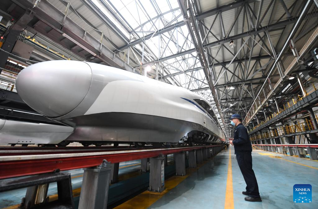 A maintenance worker checks a bullet train at a maintenance base in Nanning, south China's Guangxi Zhuang Autonomous Region, Jan. 16, 2022. Nanning section of China Railway Nanning Bureau Group Co., Ltd. started to carry out maintenance work for bullet trains recently to prepare for the country's annual Spring Festival travel rush. (Xinhua/Lu Boan)