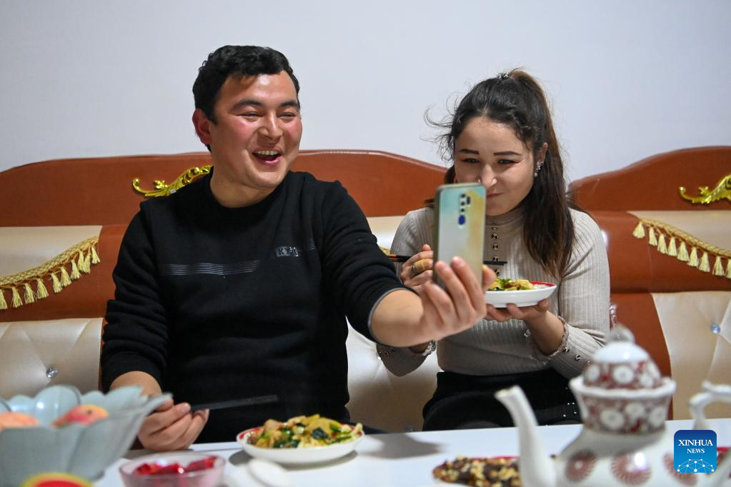Maynurhan Amang (R) and Abudulezizi Maisedi have a video chat with family members at their apartment in Tianjin industrial park in Yutian County, northwest China's Xinjiang Uygur Autonomous Region, Jan. 13, 2022. Yutian County, once a poverty-stricken area in Xinjiang, has stepped up the development of labour-intensive industries including textile, clothes and sock making.