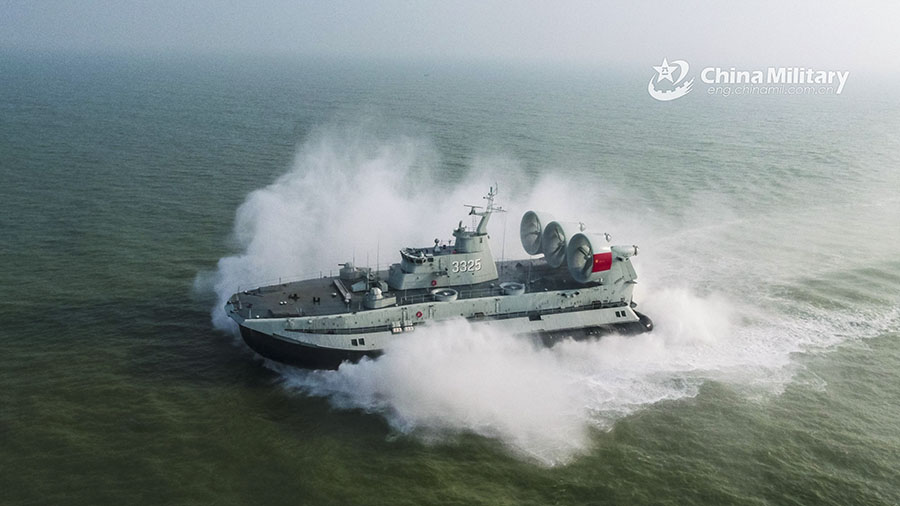 A Landing Craft Air Cushion (LCAC) attached to a naval landing ship flotilla under the PLA Southern Theater Command sails at a high speed to the beach-head during a beach landing training exercise on January 6, 2022. (eng.chinamil.com.cn/Photo by Ze Tianyu)