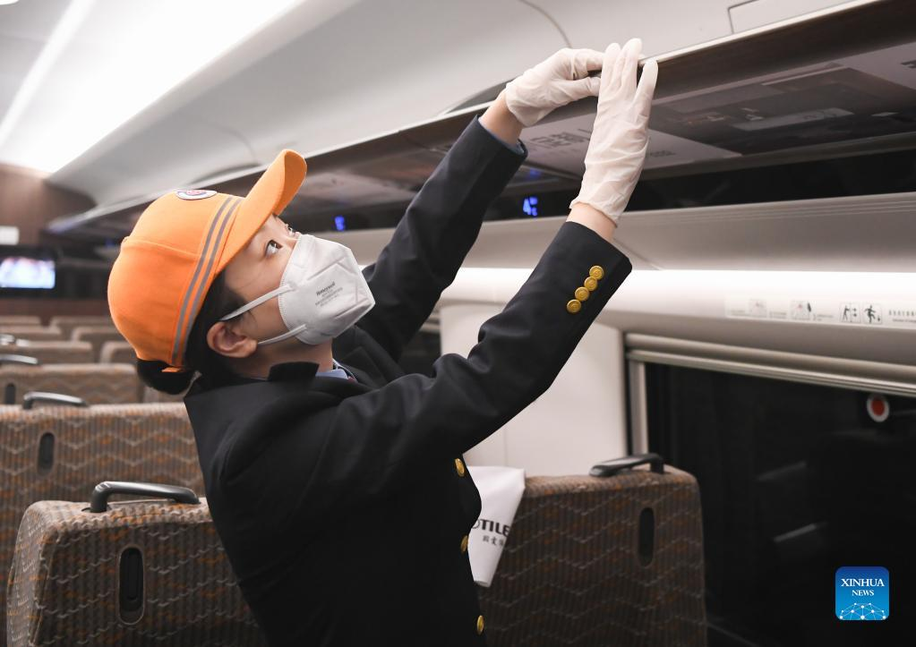 A staff member carries out a hygienic check on a train in Wuhan, central China's Hubei Province, Jan. 16, 2022. The number of railway passenger trips during China's upcoming Spring Festival travel rush is expected to jump 28.5 percent from the holiday season last year, industry data shows. During the 40-day travel season, also known as chunyun, many Chinese people will travel to meet their families for the Chinese Lunar New Year, or Spring Festival, which will fall on Feb. 1, 2022. (Xinhua/Cheng Min)