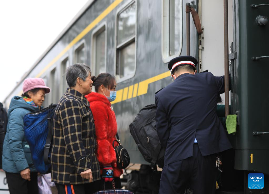 Villagers carrying their goods board a "slow train" at Shicheng Station in Fengcheng City, northeast China's Liaoning Province, Jan. 15, 2022. Trains No. 4317 and 4318 are "slow trains" operating between Tonghua of Jilin Province and Dandong of Liaoning Province in northeast China. In the run-up to the Lunar New Year, the local railway authorities have been organizing onboard markets which allow villagers living along the trains' route to sell goods to passengers without leaving the train cars. (Xinhua/Yang Qing)
