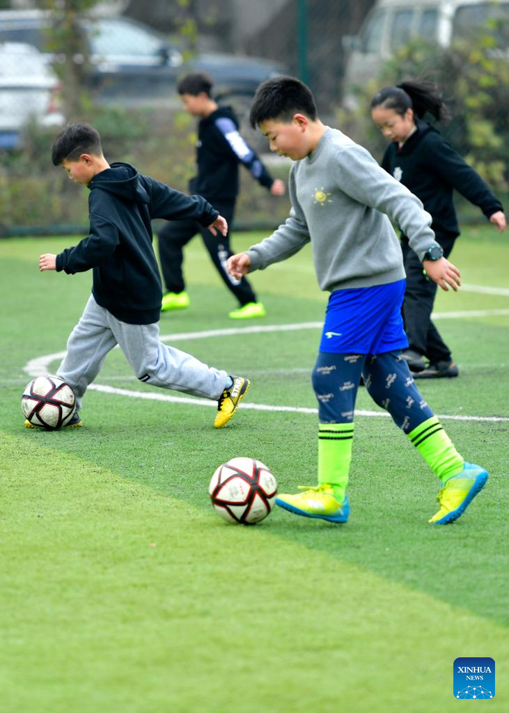 Pupils play football during winter vacation in Xuanen County, central China's Hubei Province, Jan. 18, 2022. (Photo by Song Wen/Xinhua)