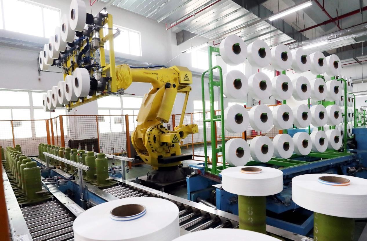 A robot works at a smart textile factory of a company based in east China’s Jiangsu province, Jan. 13, 2022. (People’s Daily Online/ Hua Xuegen)