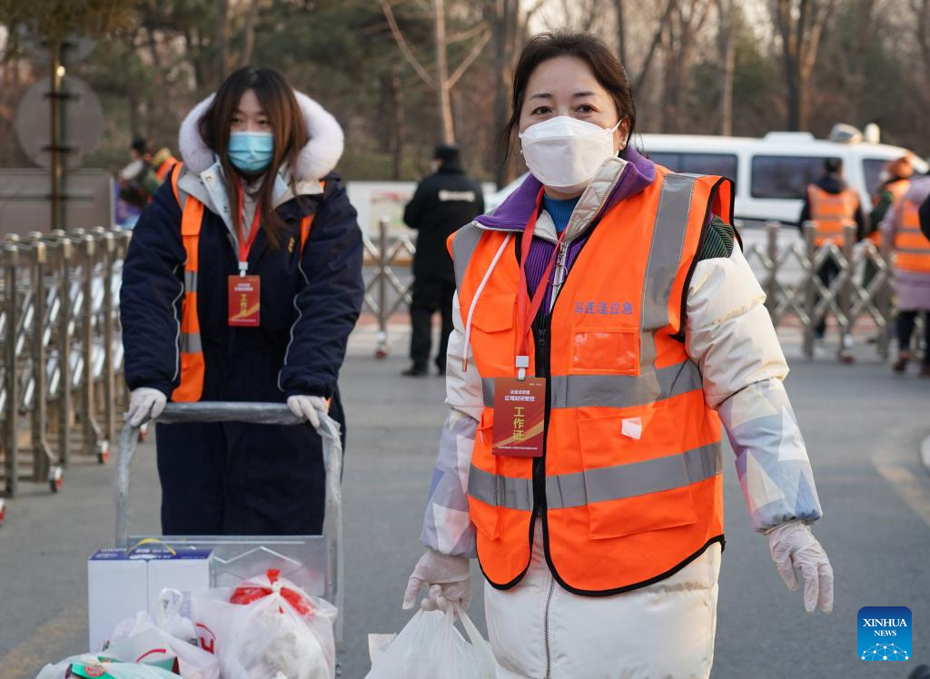 Staff members deliver daily necessities ordered by residents in quarantine at a community under close-off management where a locally transmitted COVID-19 case was found in Haidian District of Beijing, capital of China, Jan. 18, 2022. Beijing reported two confirmed locally transmitted COVID-19 cases and one other person testing positive for COVID-19 from Monday to 3 p.m. Tuesday, according to local authorities. The two confirmed cases were found in the Haidian District, while the person testing positive for COVID-19 was detected in Chaoyang District, said Pang Xinghuo, deputy head of the Beijing municipal center for disease control and prevention. The community where the newly-comfirmed case lives is under close-off management. Many frontline workers and volunteers have been devoted to ensuring sufficient food and medicine supplies for residents in the community. (Xinhua/Ren Chao)