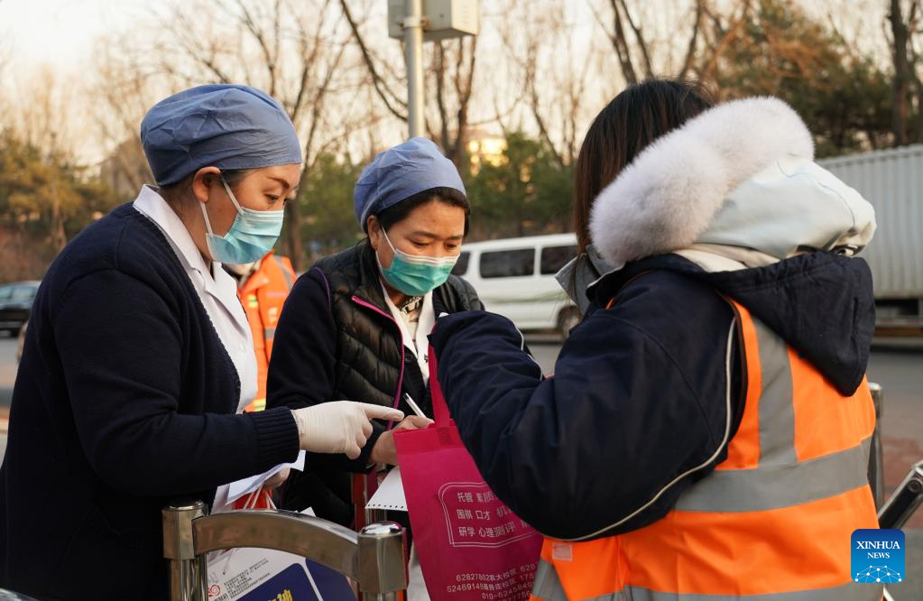 Medical workers deliver medicine for the elderly in quarantine at a community under close-off management where a locally transmitted COVID-19 case was found in Haidian District of Beijing, capital of China, Jan. 18, 2022. Beijing reported two confirmed locally transmitted COVID-19 cases and one other person testing positive for COVID-19 from Monday to 3 p.m. Tuesday, according to local authorities. The two confirmed cases were found in the Haidian District, while the person testing positive for COVID-19 was detected in Chaoyang District, said Pang Xinghuo, deputy head of the Beijing municipal center for disease control and prevention. The community where the newly-comfirmed case lives is under close-off management. Many frontline workers and volunteers have been devoted to ensuring sufficient food and medicine supplies for residents in the community. (Xinhua/Ren Chao)