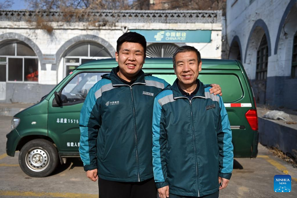 Wan Yuntian (L) and his father Wan Shouqiu pose for a photo in front of a mail van on Jan. 5, 2022. Located in a remote mountainous area in Wanbailin District of Taiyuan, Wangfeng Township had long suffered from poor transport infrastructure. In 1985, Wang Shouqiu became a postman of China Post serving Wangfeng Township, and held his post until a position transfer in 2020 due to his bad health condition.