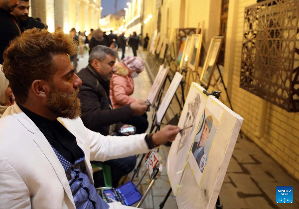 Artists draw paintings during a cultural evening event on Mutanabi Street in central Baghdad, Iraq, on Jan. 18, 2022. (Xinhua/Khalil Dawood)