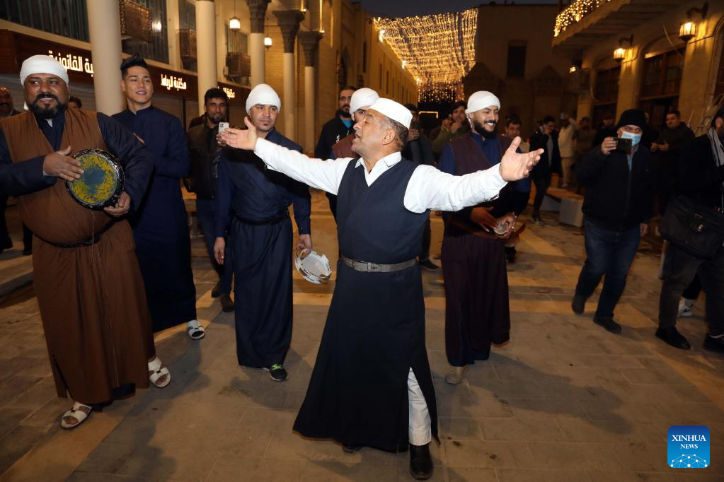 Members of a local troupe present a Baghdadi folklore performance during a cultural evening event on Mutanabi Street in central Baghdad, Iraq, on Jan. 18, 2022. (Xinhua/Khalil Dawood)