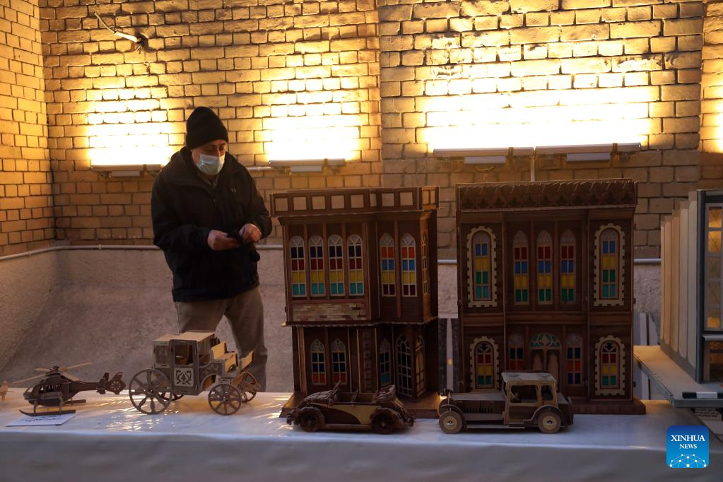 An artist displays miniature works of Baghdadi heritage houses and old cars during a cultural evening event on Mutanabi Street in central Baghdad, Iraq, on Jan. 18, 2022. (Xinhua/Khalil Dawood)