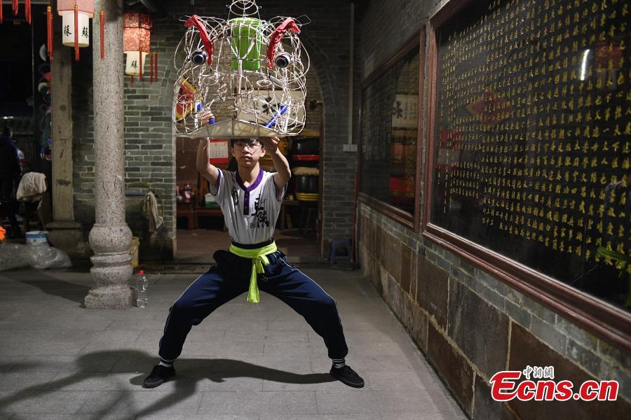 A lion dancer practices at Sugong Temple in Qingchuan, Guangzhou, South China's Guangdong Province, Jan. 18, 2022. (Photo: China News Service/Chen Chuhong)
