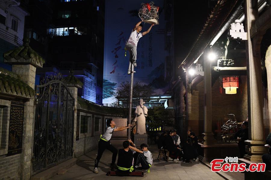 A lion dancer practices on a pole at Sugong Temple in Qingchuan, Guangzhou, South China's Guangdong Province, Jan. 18, 2022. (Photo: China News Service/Chen Chuhong)