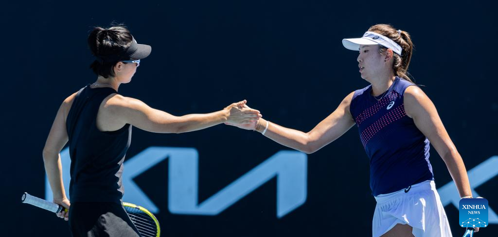 Xu Yifan/Yang Zhaoxuan (L) of China compete during the Women's Doubles first round match against Sofia Kenin of the United States/Yulia Putintseva of Kazakhstan at Australian Open in Melbourne Park, in Melbourne, Australia, Jan. 19, 2022. (Photo by Hu Jingchen/Xinhua)