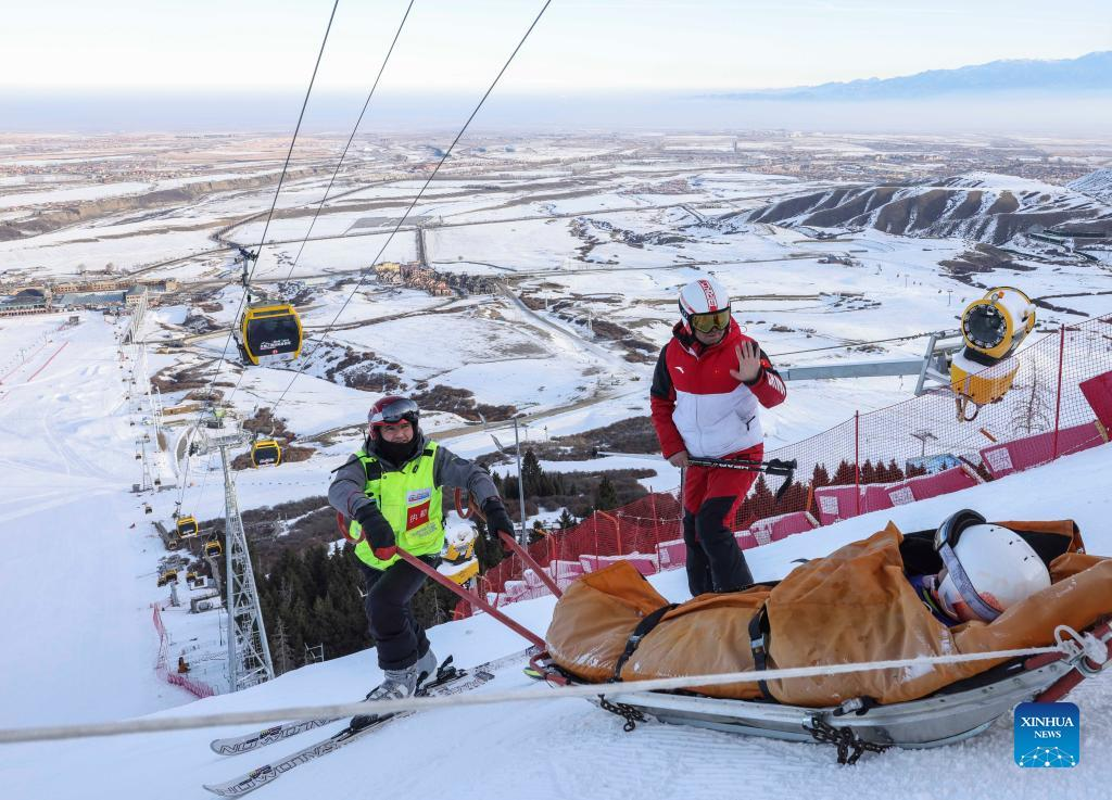 Talhat Satayr (C) talks to an "injured skier" during a drill at Silkroad Resort in Urumqi, northwest China's Xinjiang Uygur Autonomous Region, Jan. 11, 2022. Talhat Satayr, 45, is the captain of the ski patrol team, which provides rescue services for tourists in need, at Silkroad Resort in Urumqi of Xinjiang. During his early life, he spent most of his time on the pastures along the canyons on Tianshan Mountain. He began to work at Silkroad Resort, which is not far away from his home in Urumqi, 16 years ago. Being a ski patroller is not an easy job, yet Talhat knows well the responsibilities on the shoulders of him and his teammates. He has been sent to Italy and northeast China's Jilin Province to learn professional rescue knowledge and skills at ski resort. Just like Talhat, more and more people in Xinjiang now have benefited from the development of winter sports. (Xinhua/Hu Huhu)