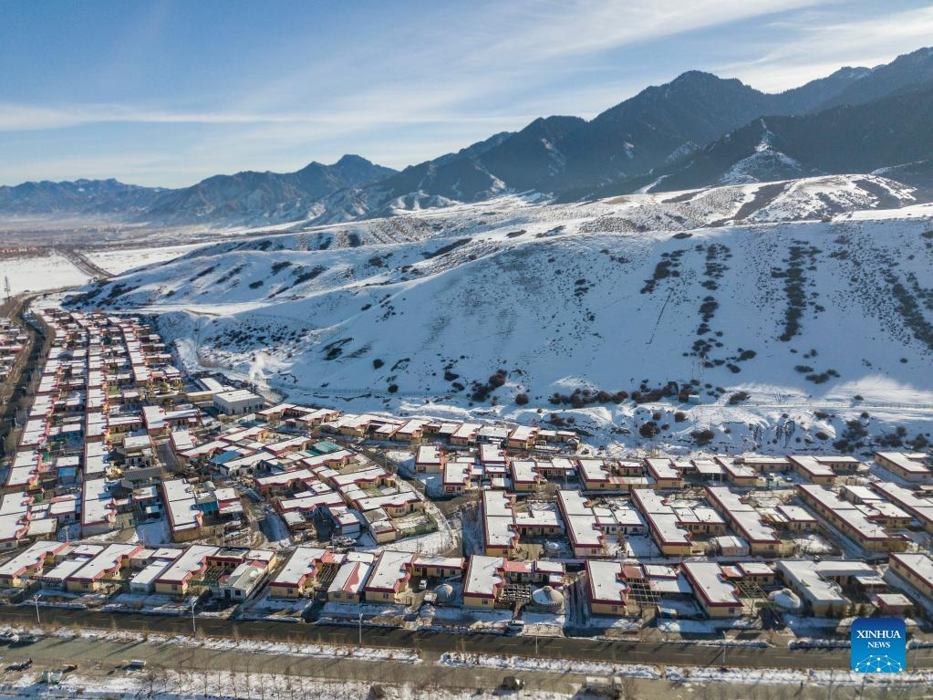 Aerial photo taken on Jan. 11, 2022 shows the village where Talhat Satayr's home is settled in Urumqi, northwest China's Xinjiang Uygur Autonomous Region. Talhat Satayr, 45, is the captain of the ski patrol team, which provides rescue services for tourists in need, at Silkroad Resort in Urumqi of Xinjiang. During his early life, he spent most of his time on the pastures along the canyons on Tianshan Mountain. He began to work at Silkroad Resort, which is not far away from his home in Urumqi, 16 years ago. Being a ski patroller is not an easy job, yet Talhat knows well the responsibilities on the shoulders of him and his teammates. He has been sent to Italy and northeast China's Jilin Province to learn professional rescue knowledge and skills at ski resort. Just like Talhat, more and more people in Xinjiang now have benefited from the development of winter sports. (Xinhua/Hu Huhu)