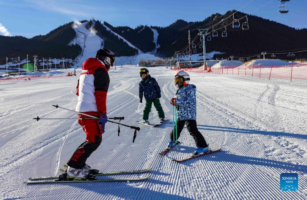 Photo taken on Jan. 10, 2022 shows Talhat Satayr (L) running into his son (R) skiing at Silkroad Resort in Urumqi, northwest China's Xinjiang Uygur Autonomous Region. Talhat Satayr, 45, is the captain of the ski patrol team, which provides rescue services for tourists in need, at Silkroad Resort in Urumqi of Xinjiang. During his early life, he spent most of his time on the pastures along the canyons on Tianshan Mountain. He began to work at Silkroad Resort, which is not far away from his home in Urumqi, 16 years ago. Being a ski patroller is not an easy job, yet Talhat knows well the responsibilities on the shoulders of him and his teammates. He has been sent to Italy and northeast China's Jilin Province to learn professional rescue knowledge and skills at ski resort. Just like Talhat, more and more people in Xinjiang now have benefited from the development of winter sports. (Xinhua/Hu Huhu)