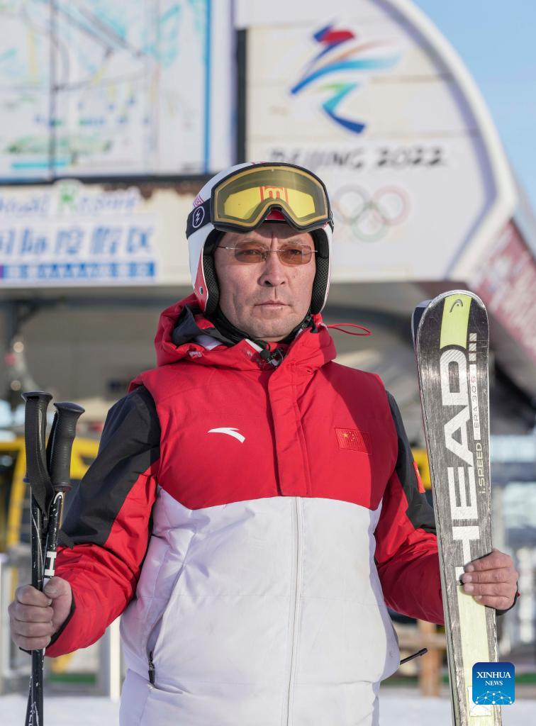 Photo taken on Jan. 11, 2022 shows Talhat Satayr at Silkroad Resort in Urumqi, northwest China's Xinjiang Uygur Autonomous Region. Talhat Satayr, 45, is the captain of the ski patrol team, which provides rescue services for tourists in need, at Silkroad Resort in Urumqi of Xinjiang. During his early life, he spent most of his time on the pastures along the canyons on Tianshan Mountain. He began to work at Silkroad Resort, which is not far away from his home in Urumqi, 16 years ago. Being a ski patroller is not an easy job, yet Talhat knows well the responsibilities on the shoulders of him and his teammates. He has been sent to Italy and northeast China's Jilin Province to learn professional rescue knowledge and skills at ski resort. Just like Talhat, more and more people in Xinjiang now have benefited from the development of winter sports. (Xinhua/Hu Huhu)