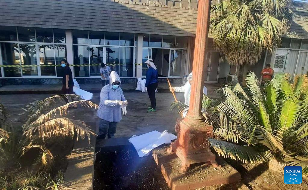 Photo taken on Jan. 20, 2022 shows houses and infrastructures hit by tsunami in Nuku'alofa, capital of Tonga. On Friday and Saturday, the Hunga Tonga-Hunga Ha'apai volcano in Tonga erupted violently and triggered tsunami in Tonga. (Photo by Marian Kupu/Xinhua)