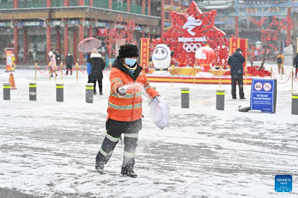 A sanitation worker scatters snow-melting agent on a road in Beijing, capital of China, Jan. 20, 2022. (Xinhua/Li Xin)