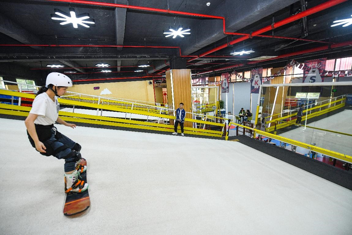 A girl practices skateboarding under the instruction of a coach at an indoor skiing venue in Haikou, capital of south China’s Hainan province, Jan. 16, 2022. (People’s Daily Online/Wang Chenglong)