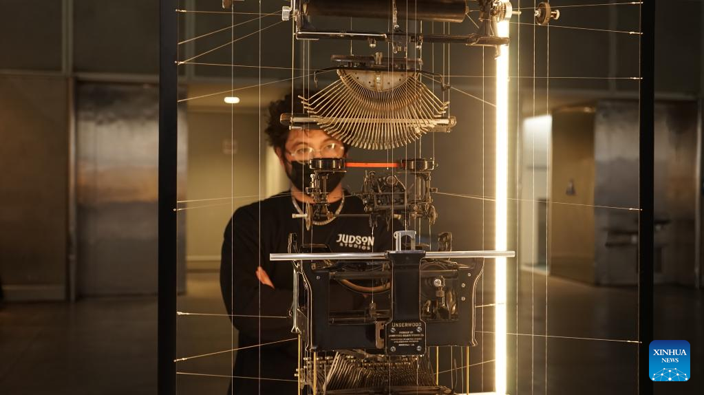 A person visits the LA Art Show in Los Angeles, the United States, Jan. 19, 2022. LA Art Show, the most comprehensive international contemporary art show in America, returned to the Los Angeles Convention Center as an in-person event on Wednesday evening despite the ongoing COVID-19 pandemic. (Photo by Zeng Hui/Xinhua)