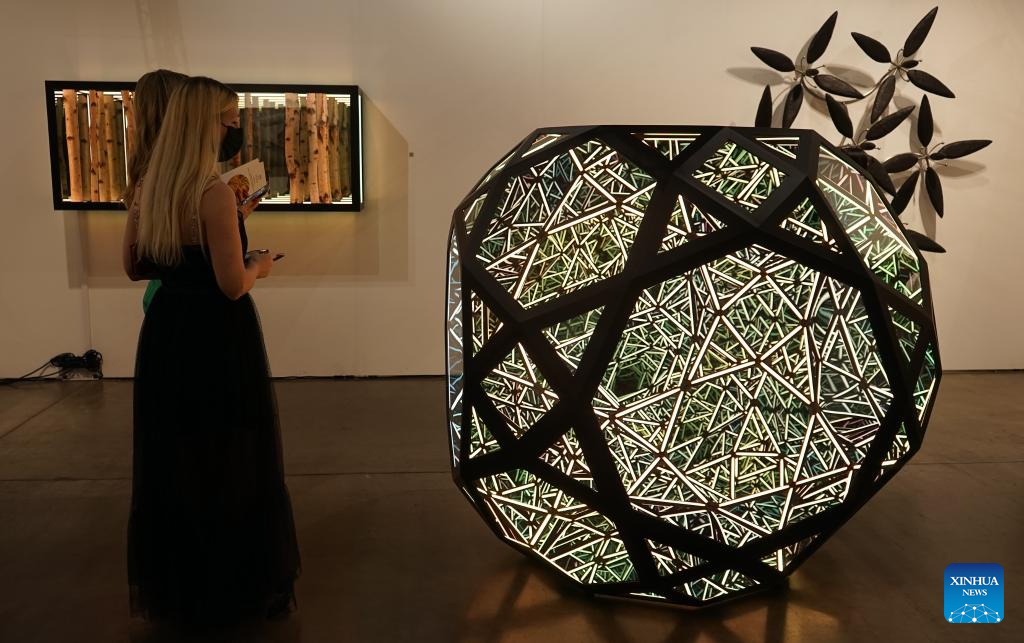 People visit the LA Art Show in Los Angeles, the United States, Jan. 19, 2022. LA Art Show, the most comprehensive international contemporary art show in America, returned to the Los Angeles Convention Center as an in-person event on Wednesday evening despite the ongoing COVID-19 pandemic. (Photo by Zeng Hui/Xinhua)