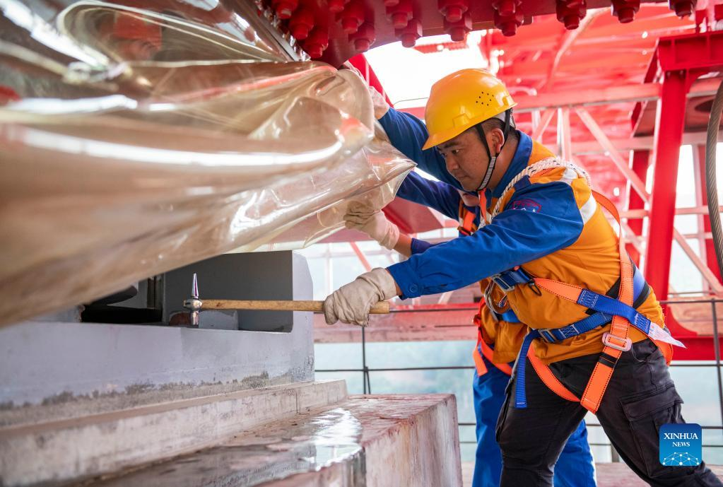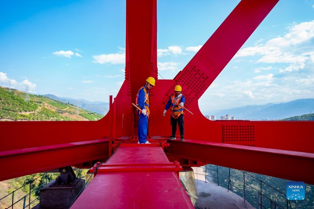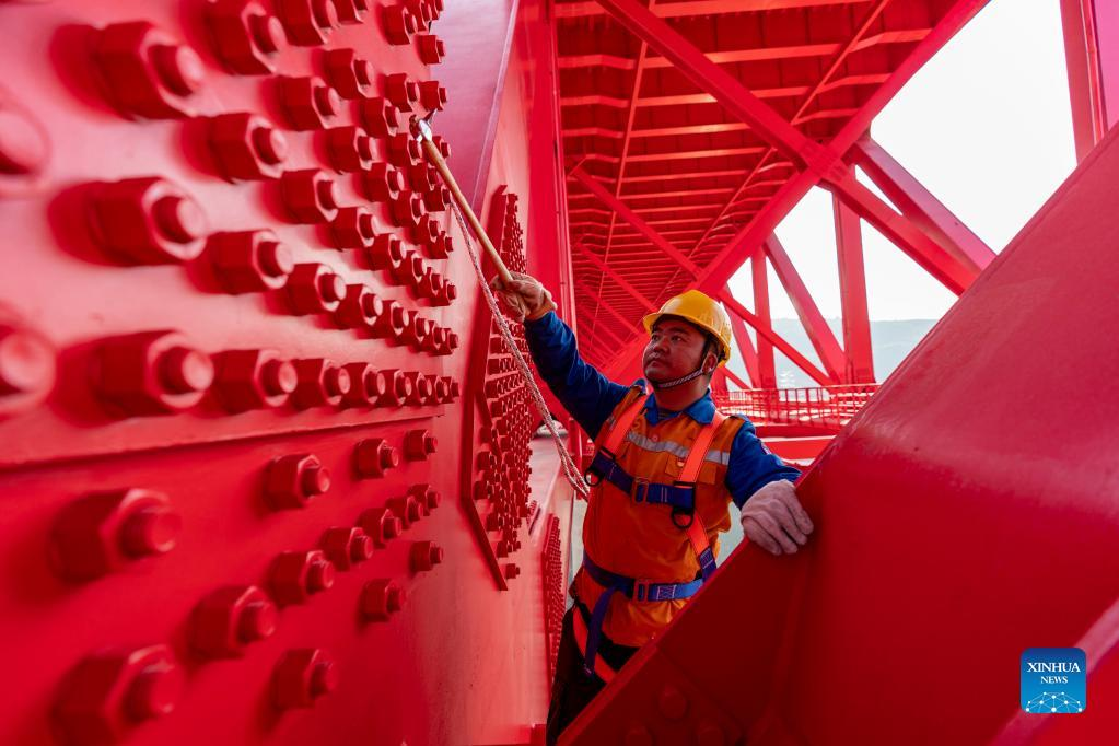 Shi Pengbin (L) and his colleague work on the Yuanjiang major bridge over the Yuanjiang River in southwest China's Yunnan Province, Jan. 18, 2022. Shi Pengbin, 28, is a technician responsible for maintaining the Yuanjiang major bridge, a key bridge of the China-Laos Railway project. Spanning a full length of 832.2 meters, the Yuanjiang bridge uses six bridge piers with the No.3 bridge pier, the highest pier, standing at 154 meters. Shi, who started working for the construction of the China-Laos Railway from April 2020, even postponed his wedding to guarantee on-time completion of the bridge. After the operation of China-Laos Railway, Shi's work includes checking the bridge in high places during the day, and repairing the bridge floor during the break time for rail service at night. During this year's Spring Festival holiday, Shi and his colleagues will stick to their posts to secure the railway transportation. (Xinhua/Chen Xinbo)