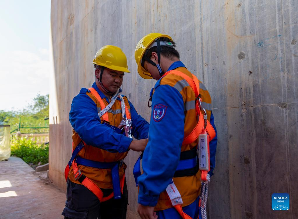 Shi Pengbin (R), arranges his safety belt at the Yuanjiang major bridge over the Yuanjiang River in southwest China's Yunnan Province, Jan. 18, 2022. Shi Pengbin, 28, is a technician responsible for maintaining the Yuanjiang major bridge, a key bridge of the China-Laos Railway project. Spanning a full length of 832.2 meters, the Yuanjiang bridge uses six bridge piers with the No.3 bridge pier, the highest pier, standing at 154 meters. Shi, who started working for the construction of the China-Laos Railway from April 2020, even postponed his wedding to guarantee on-time completion of the bridge. After the operation of China-Laos Railway, Shi's work includes checking the bridge in high places during the day, and repairing the bridge floor during the break time for rail service at night. During this year's Spring Festival holiday, Shi and his colleagues will stick to their posts to secure the railway transportation. (Xinhua/Chen Xinbo)