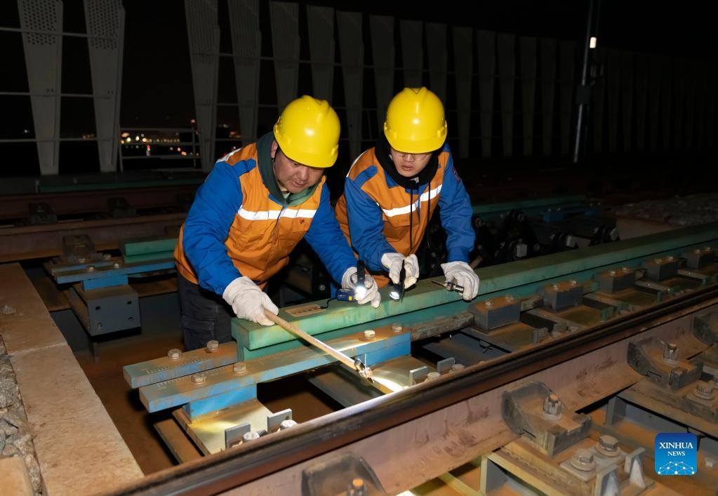 Shi Pengbin (R) and his colleague work on the Yuanjiang major bridge over the Yuanjiang River in southwest China's Yunnan Province, Jan. 18, 2022. Shi Pengbin, 28, is a technician responsible for maintaining the Yuanjiang major bridge, a key bridge of the China-Laos Railway project. Spanning a full length of 832.2 meters, the Yuanjiang bridge uses six bridge piers with the No.3 bridge pier, the highest pier, standing at 154 meters. Shi, who started working for the construction of the China-Laos Railway from April 2020, even postponed his wedding to guarantee on-time completion of the bridge. After the operation of China-Laos Railway, Shi's work includes checking the bridge in high places during the day, and repairing the bridge floor during the break time for rail service at night. During this year's Spring Festival holiday, Shi and his colleagues will stick to their posts to secure the railway transportation. (Xinhua/Chen Xinbo)
