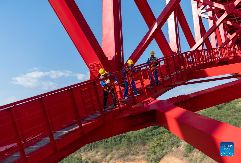 Shi Pengbin (L) and his colleague maintain the Yuanjiang major bridge over the Yuanjiang River in southwest China's Yunnan Province, Jan. 19, 2022. Shi Pengbin, 28, is a technician responsible for maintaining the Yuanjiang major bridge, a key bridge of the China-Laos Railway project. Spanning a full length of 832.2 meters, the Yuanjiang bridge uses six bridge piers with the No.3 bridge pier, the highest pier, standing at 154 meters. Shi, who started working for the construction of the China-Laos Railway from April 2020, even postponed his wedding to guarantee on-time completion of the bridge. After the operation of China-Laos Railway, Shi's work includes checking the bridge in high places during the day, and repairing the bridge floor during the break time for rail service at night. During this year's Spring Festival holiday, Shi and his colleagues will stick to their posts to secure the railway transportation. (Xinhua/Chen Xinbo)