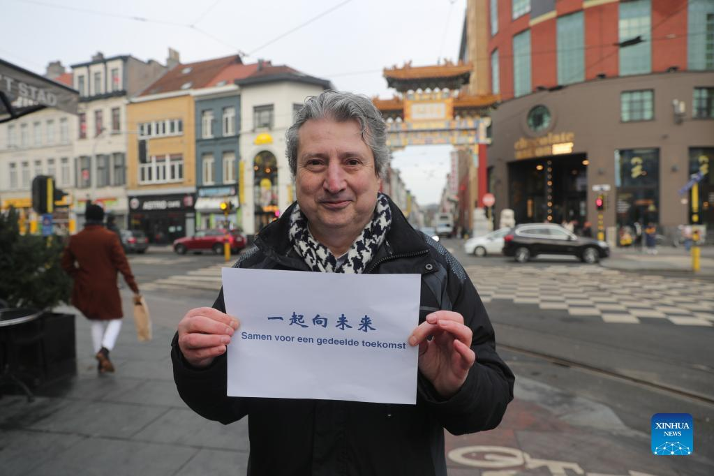 Ludo Van Campenhout, honorary vice mayor of Antwerp, poses with a piece of paper printing "Together for a Shared Future", the official motto for Beijing 2022, in Antwerp, Belgium, on Jan. 12, 2022. With less than two weeks to go before the start of the 2022 Winter Olympics in Beijing, people around the world are eagerly expressing their joy over the sporting extravaganza. (Xinhua/Zheng Huansong)