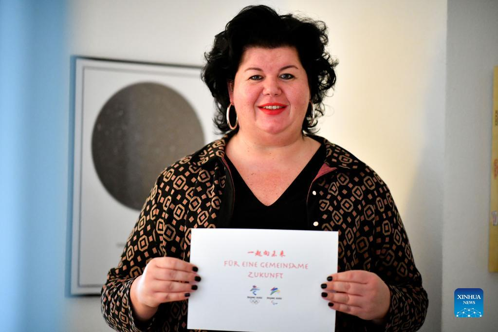 Sonja Hufnagel, a bank clerk, poses with a piece of paper printing "Together for a Shared Future", the official motto for Beijing 2022, in Finnentrop, Germany, on Jan. 17, 2022. With less than two weeks to go before the start of the 2022 Winter Olympics in Beijing, people around the world are eagerly expressing their joy over the sporting extravaganza. (Photo by Ulrich Hufnagel/Xinhua)