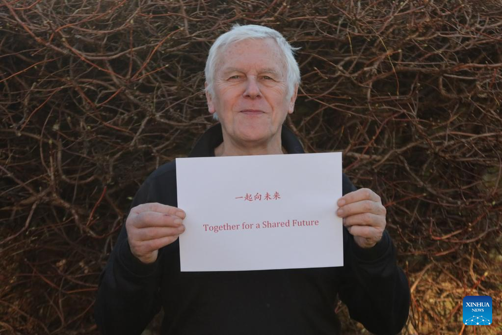 Philip Ireland from Britain poses with a piece of paper printing "Together for a Shared Future", the official motto for Beijing 2022, near Colosseo, in Winchester, Britain, on Jan. 17, 2022. With less than two weeks to go before the start of the 2022 Winter Olympics in Beijing, people around the world are eagerly expressing their joy over the sporting extravaganza. (Photo by Tim Ireland/Xinhua)