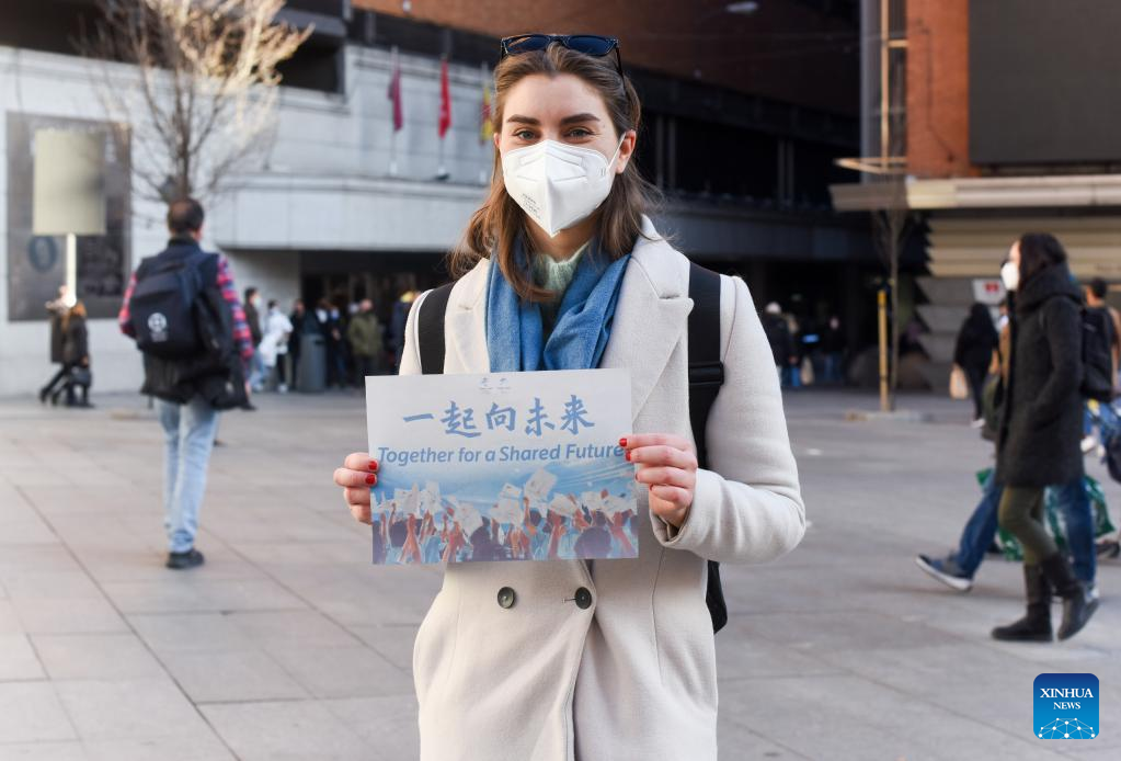 Alina poses with a piece of paper printing "Together for a Shared Future", the official motto for Beijing 2022, in Madrid, Spain, on Jan. 18, 2022. With less than two weeks to go before the start of the 2022 Winter Olympics in Beijing, people around the world are eagerly expressing their joy over the sporting extravaganza. (Xinhua/Meng Dingbo)