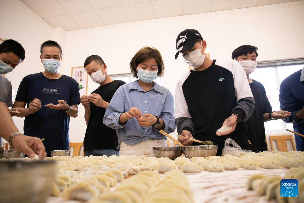 Staff members of the China-Laos Railway Luang Prabang Operation Management Center make dumplings at the center in Luang Prabang, Laos, Jan. 22, 2022. China-Laos Railway Luang Prabang Operation Management Center, run by China Railway Kunming Group, held celebration activities on Sunday for the upcoming Chinese Lunar New Year. (Photo by Kaikeo Saiyasane/Xinhua)