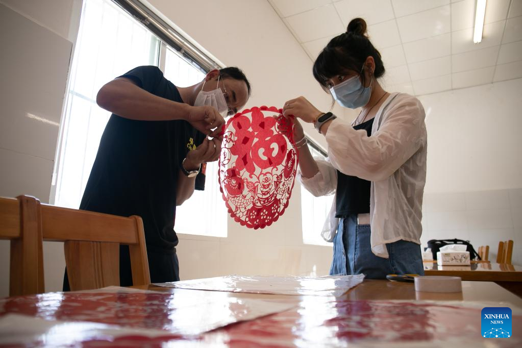 Staff members of the China-Laos Railway Luang Prabang Operation Management Center prepare paper-cutting artworks at the center in Luang Prabang, Laos, Jan. 22, 2022. China-Laos Railway Luang Prabang Operation Management Center, run by China Railway Kunming Group, held celebration activities on Sunday for the upcoming Chinese Lunar New Year. (Photo by Kaikeo Saiyasane/Xinhua)