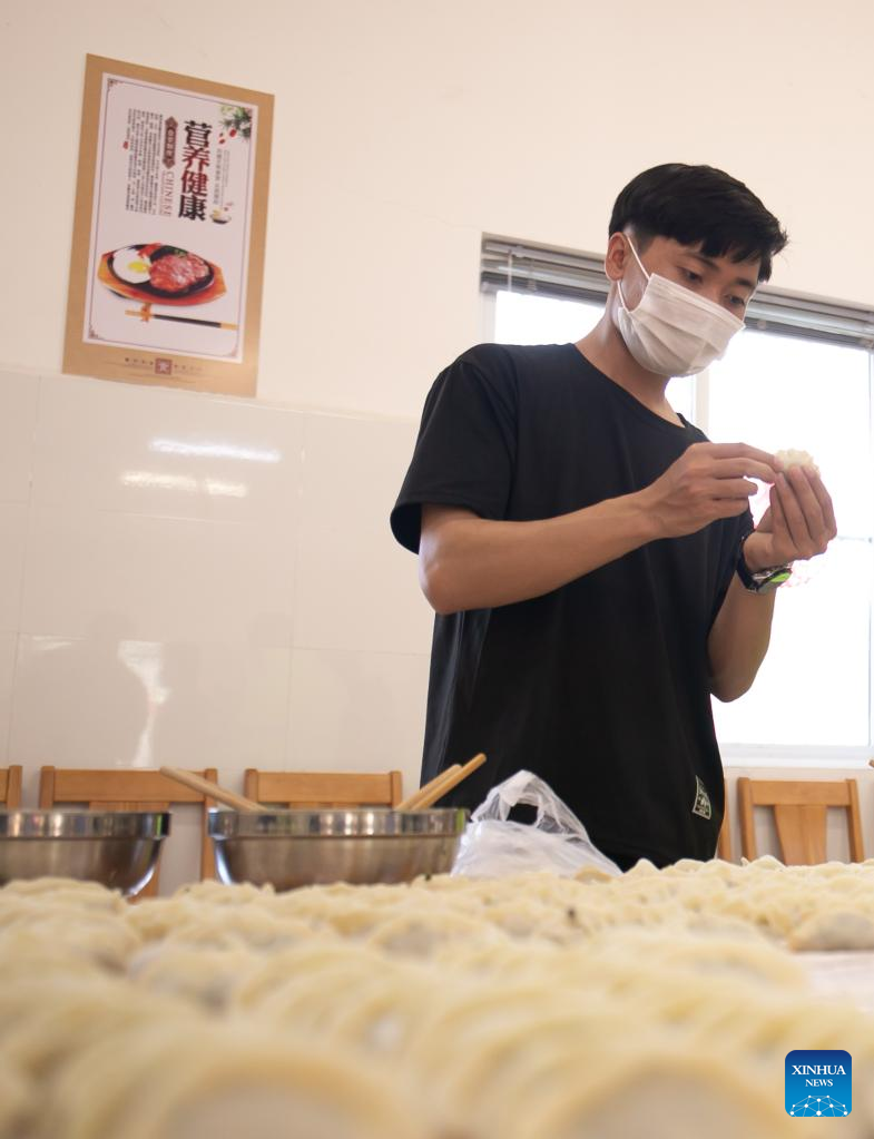 A staff member of the China-Laos Railway Luang Prabang Operation Management Center makes dumplings at the center in Luang Prabang, Laos, Jan. 22, 2022. China-Laos Railway Luang Prabang Operation Management Center, run by China Railway Kunming Group, held celebration activities on Sunday for the upcoming Chinese Lunar New Year. (Photo by Kaikeo Saiyasane/Xinhua)