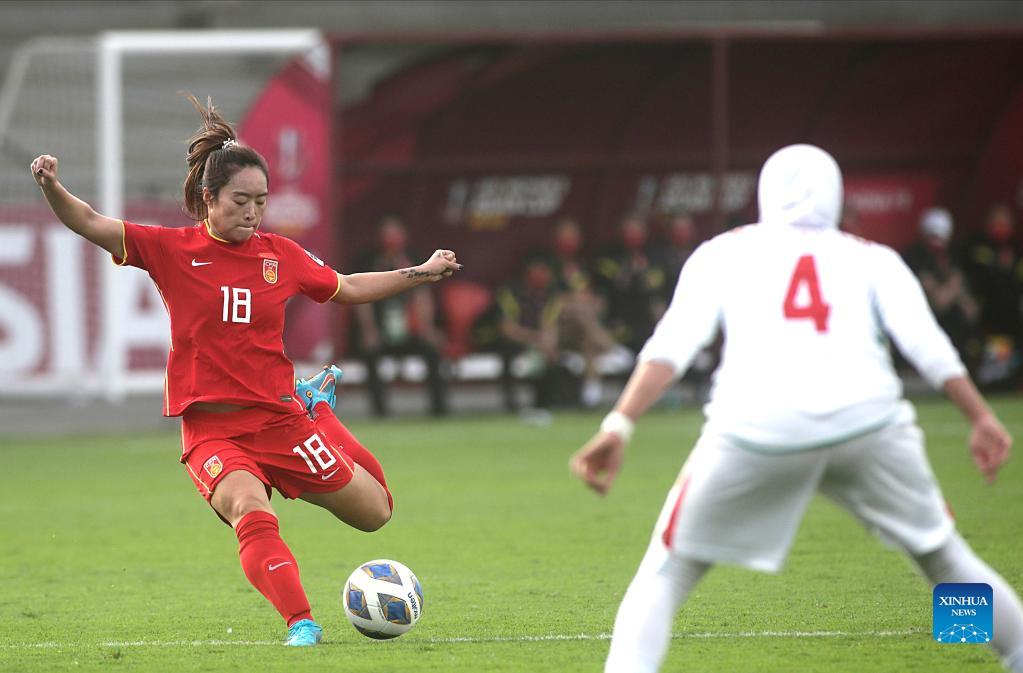 Tang Jiali (L) of China shoots during the Group A football match at the 2022 AFC Women's Asian Cup in Football Arena Mumbai, India, Jan. 23, 2022. (Str/Xinhua)