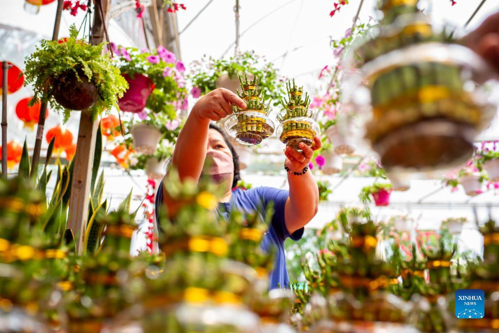 A woman picks plants for Chinese New Year at a plant shop near Kuala Lumpur, Malaysia, Jan. 23, 2022. People decorate their houses with plants and flowers as well as traditional decorations such as red lanterns and couplets as the Chinese New Year draws closer. (Xinhua/Zhu Wei)