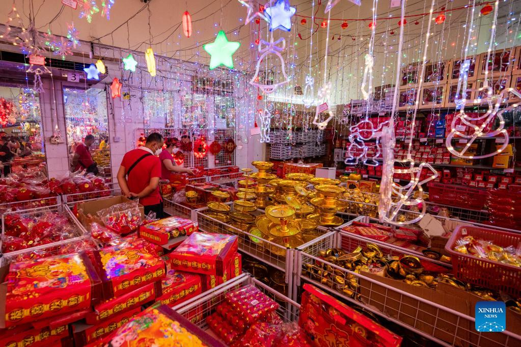 People buy decorations for Chinese New Year at a store in Kuala Lumpur, Malaysia, Jan. 23, 2022. People decorate their houses with plants and flowers as well as traditional decorations such as red lanterns and couplets as the Chinese New Year draws closer. (Xinhua/Zhu Wei)