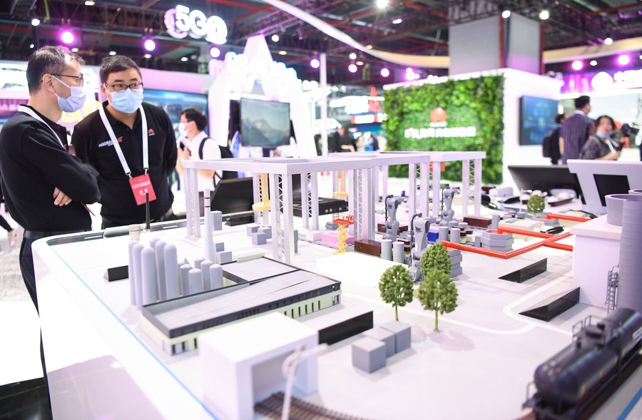 Photo taken on Nov. 26, 2020 shows a model of a 5G-supported smart factory at a 5G-themed exhibition held during the World 5G Convention in Guangzhou, south China's Guangdong Province. (Xinhua/Deng Hua)